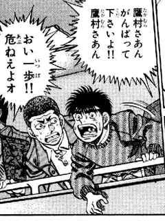 鷹村さんが心配で試合に見入っていた青木が、思わず一歩の方を心配してしまう程の乗り出しっぷり。